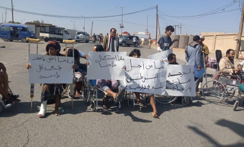 نفذ عدد من جرحى الجيش الوطني اليوم وقفة احتجاجية بمدينة مأرب، وقاموا بقطع عدد من الشوارع احتجاجا هلى اهمالهم وعدم توفير العلاج والرعاية لهم.