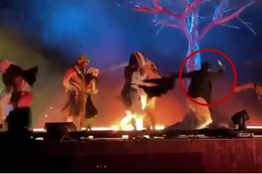 وأظهر تسجيل مصور المهاجم، الذي ذكرت السلطات أنه يبلغ من العمر 33 عاما، وهو يعتلي خشبة المسرح ويهاجم الممثلين بسكين قبل أن يتدخل عناصر الأمن لتوقيفه.