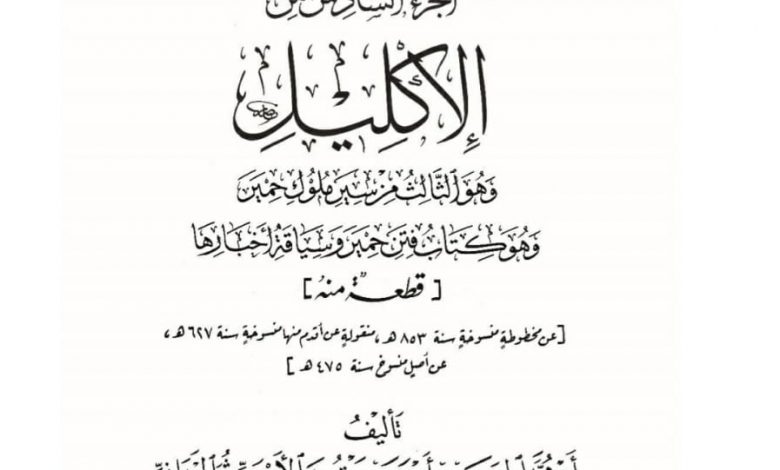 صدر الجزء السادس من “الإكليل” لأبي محمد الحسن بن احمد الهمداني، والذي يعد واحدا من اشهر الكتب التاريخية على مستوى اليمن والمنطقة، بعد العثور على هذا الجزء المختفي منذ عقود