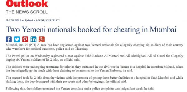 و نقلت عن مسؤول في شرطة بومباي، تأكيده انه تم تسجيل القضية والمتهم فيها كل من فهد رضوان المقطري وعلي عبد الغنى على الغزي، بعدما نصبا على الجرحى واستولوا على اكثر من 200.000 الف روبية هندية من كل شخص، مايساوي 2700 دولار أمريكي تقريبا