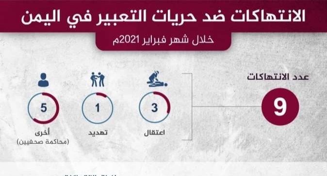 وذكر المرصد في تقريره الشهري أنه رصد خلال شهر فبراير 9 حالات انتهاك ضد الحريات الاعلامية في اليمن تنوعت بين ثلاث حالات اعتقال وحالة تهديد واحده وجلسة محاكمة لخمسة صحفيين وتوزعت بين محافظة صنعاء بعدد 5 حالات انتهاك ومحافظة حضرموت بعدد 3 حالات و حالة انتهاك وحيدة في محافظة تعز .