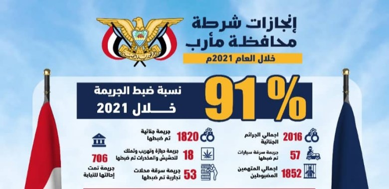 وذكرت شرطة محافظة مأرب في تقريرها ، أن إجمالي الجرائم الجنائية التي سجلت خلال العام الماضي بلغت 2016 جريمة ضبطت منها 1820 بالإضافة إلى الجرائم المدورة من الأعوام السابقة وعددها 83 جريمة