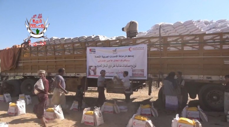الهلال الأحمر الإماراتي يسير قافلة غذائية الى مديرية حريب بمأرب