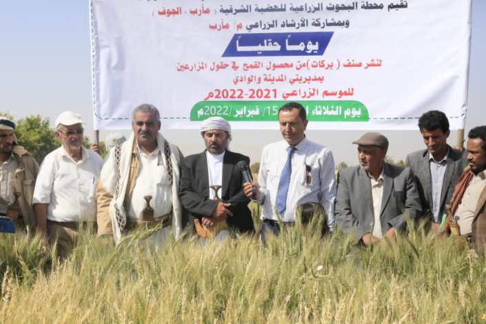 نظمت محطة البحوث الزراعية للهضبة الشرقية في محافظتي مأرب و الجوف اليوم، يوماً حقلياً لنشر صنف جديد من بذور القمح المحسنة وتوزيعه على حقول المزارعين في مديريتي مدينة مأرب والوادي.