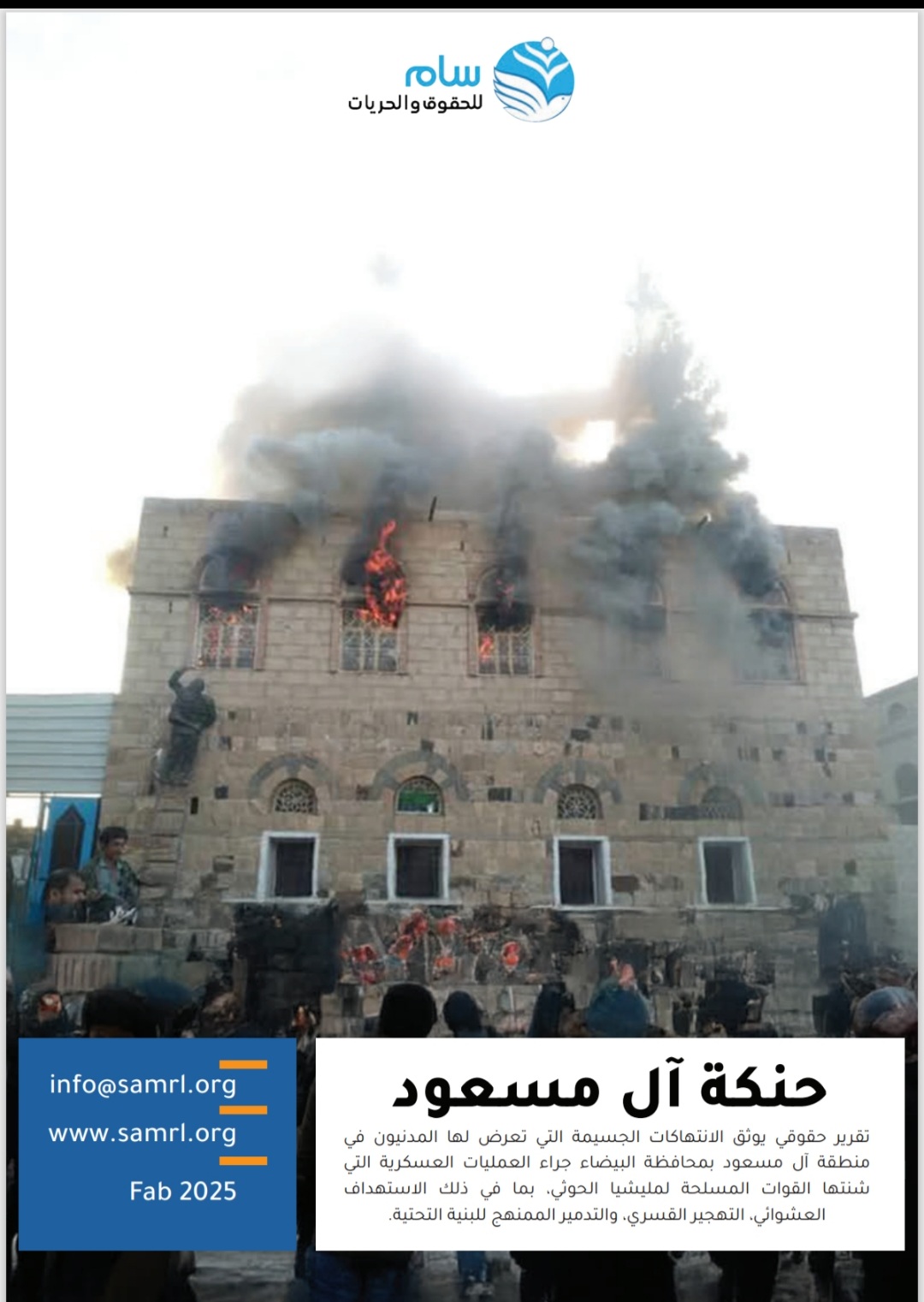 أصدرت منظمة “سام للحقوق والحريات” اليوم تقريرًا حقوقيًا يسلط الضوء على الجرائم والانتهاكات الجسيمة التي ارتكبتها جماعة الحوثي ضد سكان منطقة حنكة آل مسعود في محافظة البيضاء خلال يناير الماضي.